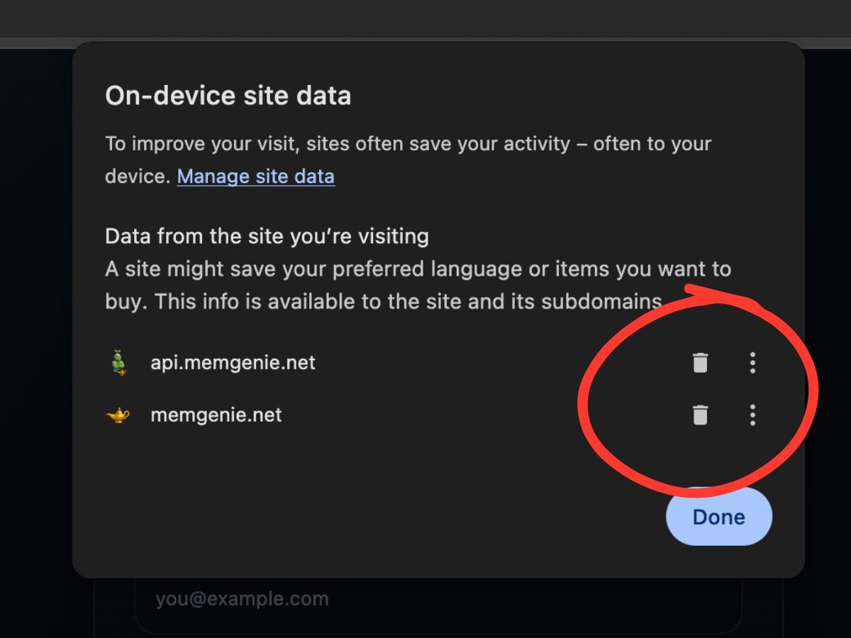 Click the two trash icons to clear cookies from both sites